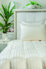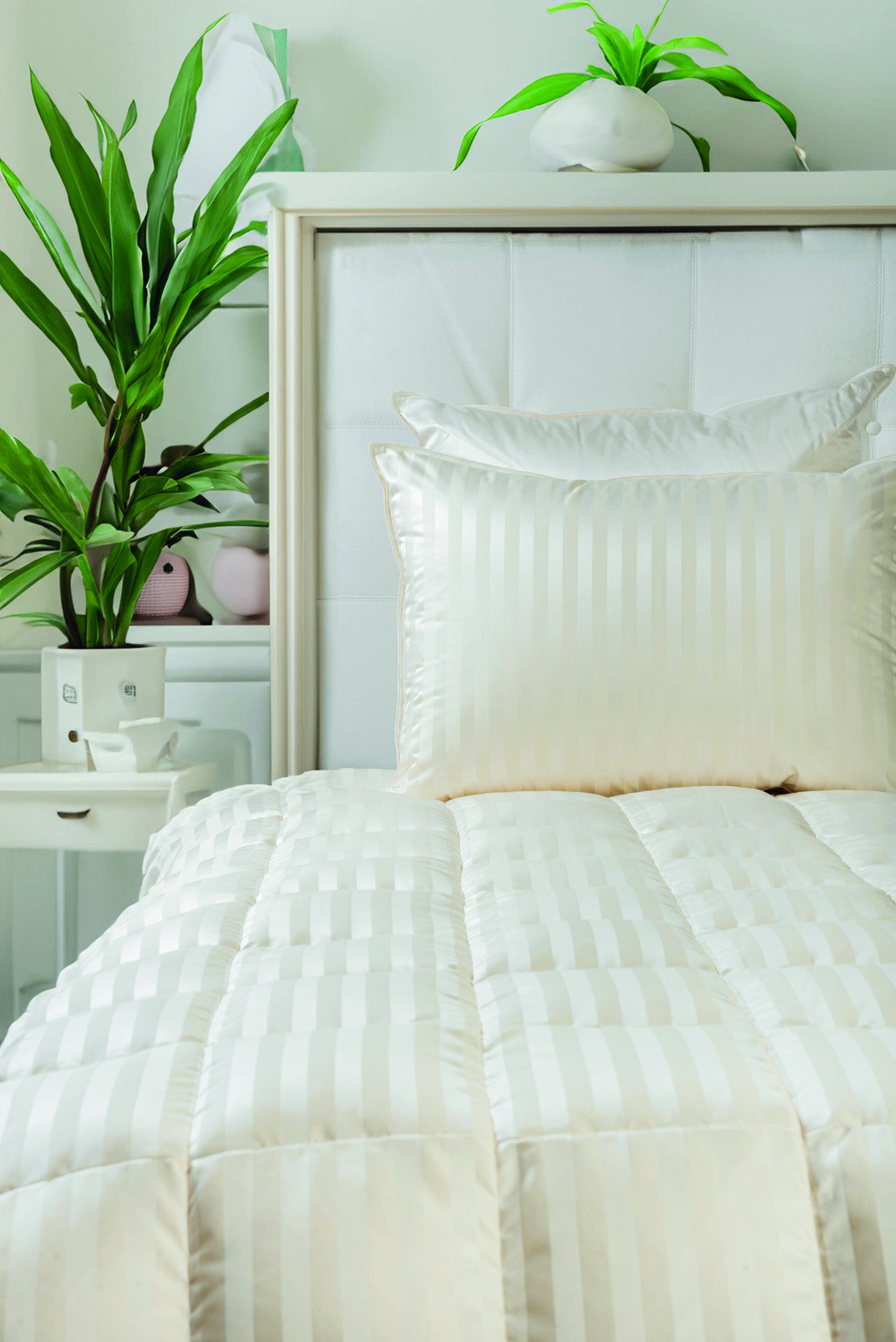 Dvi išorinės kameros, kurios apgaubia vidinę kamerą yra iš pūkui nepralaidaus žakardinio šilko užpildytos 100% pūkų užpildu. Jų dėka kaskart dėsite galvą tarsi ant debesies.