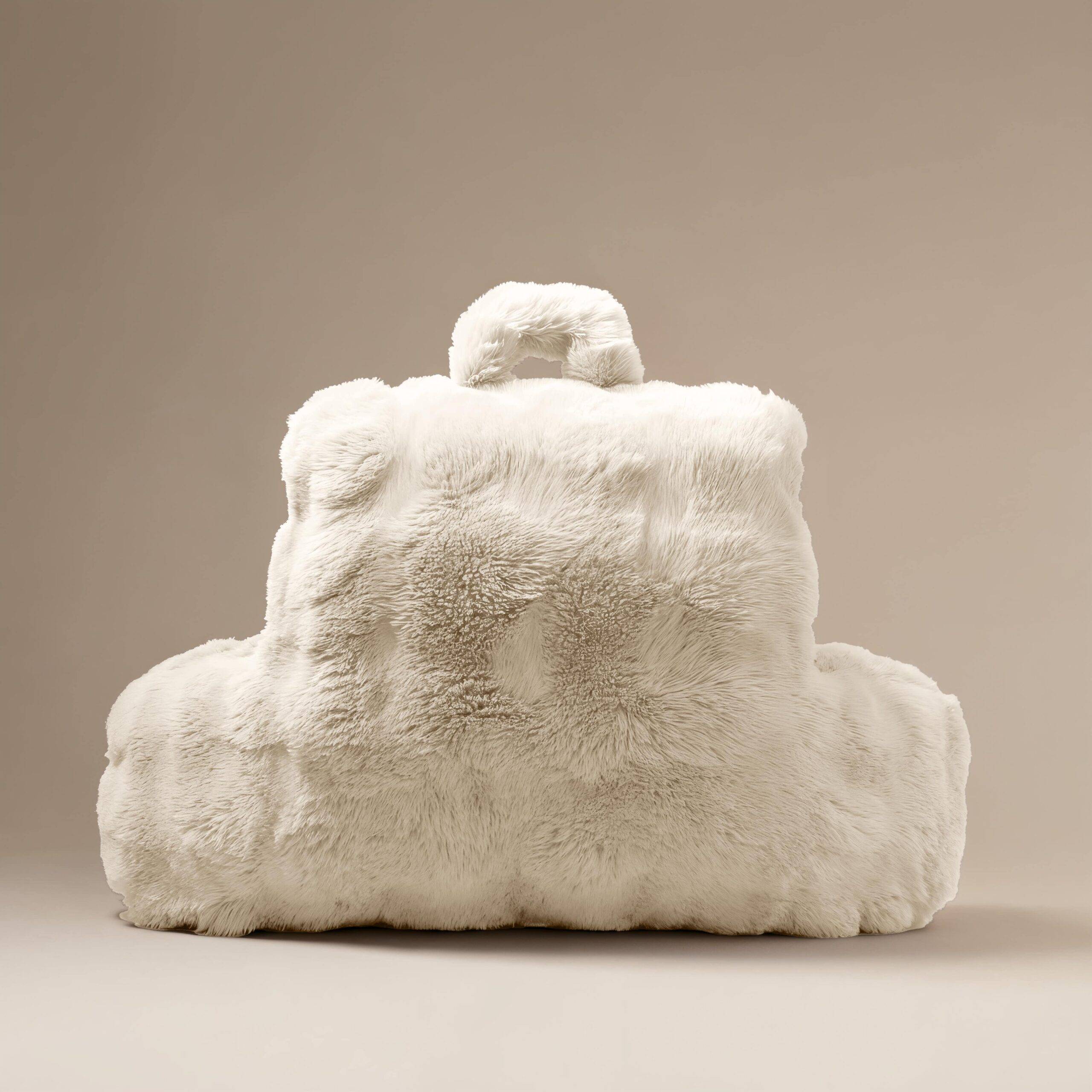 - Dizainas: Pagalvė yra didelė, suformuota taip, kad užtikrintų tvirtą atramą nugarai ir pečiams. Ji turi dvi šonines atramas (ranktūrius) ir dekoratyvinį kailiuką viršuje.