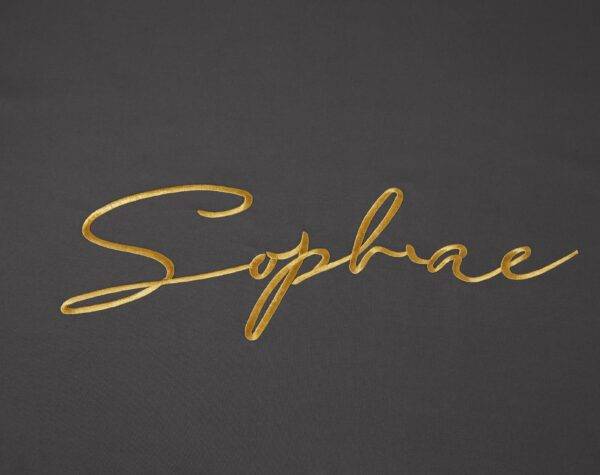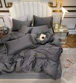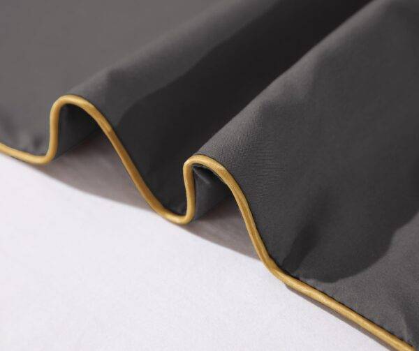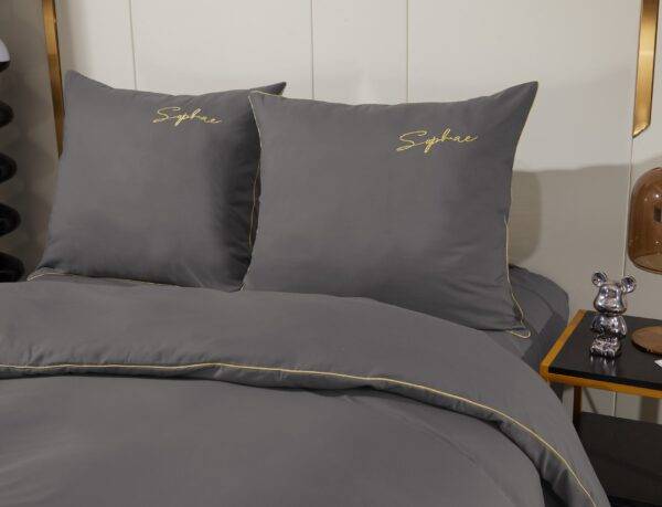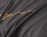 Siuvinėta antklodės užvalkalas ir pagalvių užvalkalai. Su elegantišku aukso spalvos apsiuvimu.