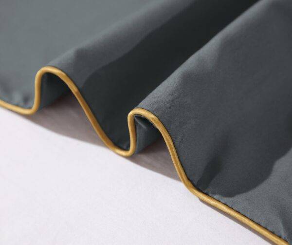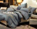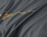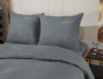 Siuvinėta antklodės užvalkalas ir pagalvių užvalkalai. Su elegantišku aukso spalvos apsiuvimu.
