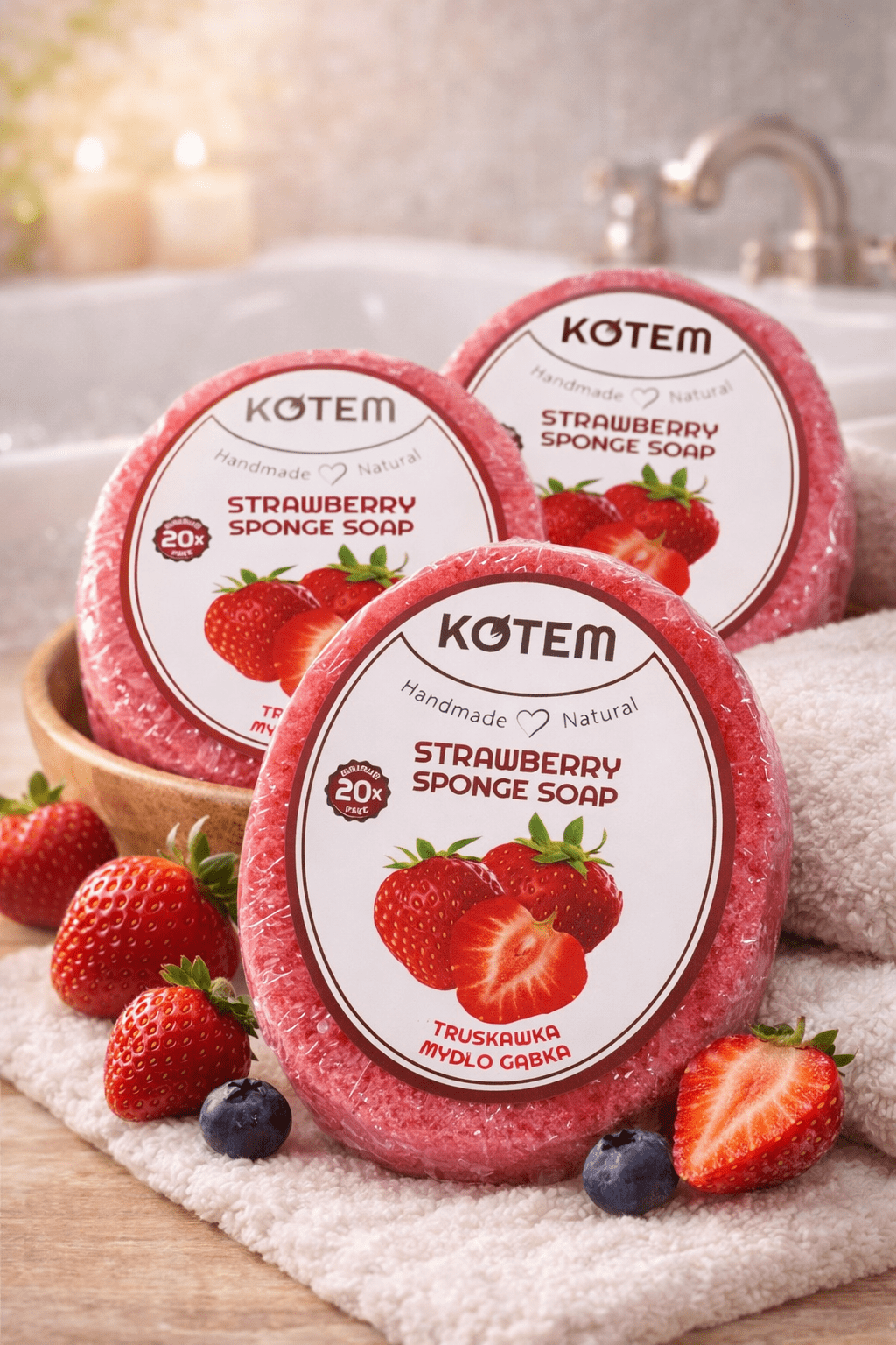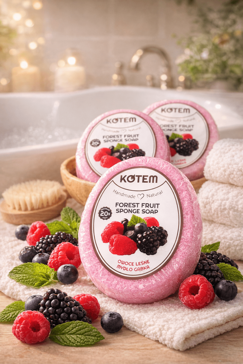 - Rankų muilas-kempinė su uogų ekstraktais: Švelnus valymas ir drėkinimas.