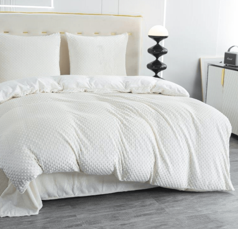 Komplekto viena pusė dekoruota iškiliom detalėm ir yra ilgesnio puraus plauko, o kita pusė kaip ir paklodė lygi. Itin švelnus, minkštas ir šiltas patalynės komplektas.