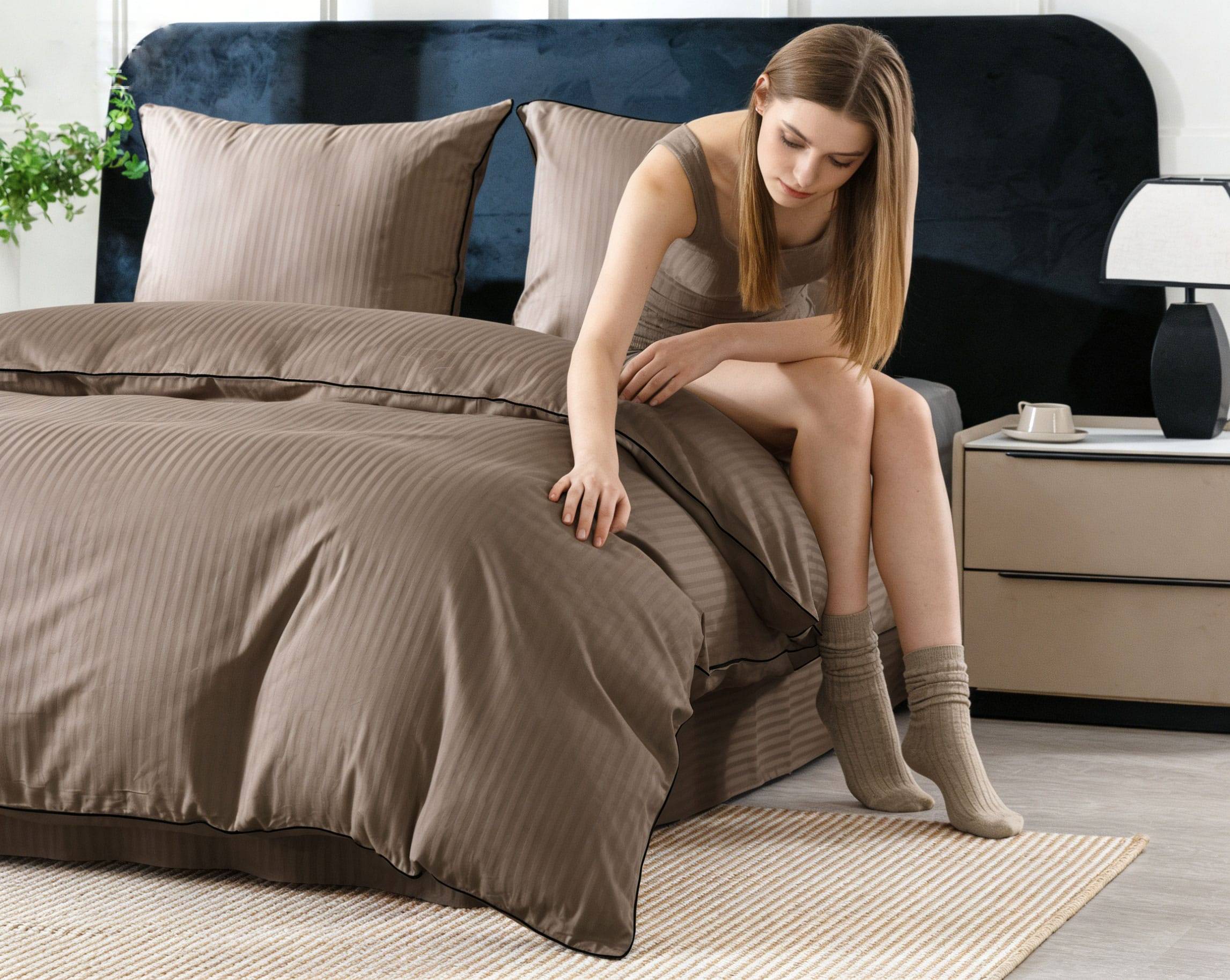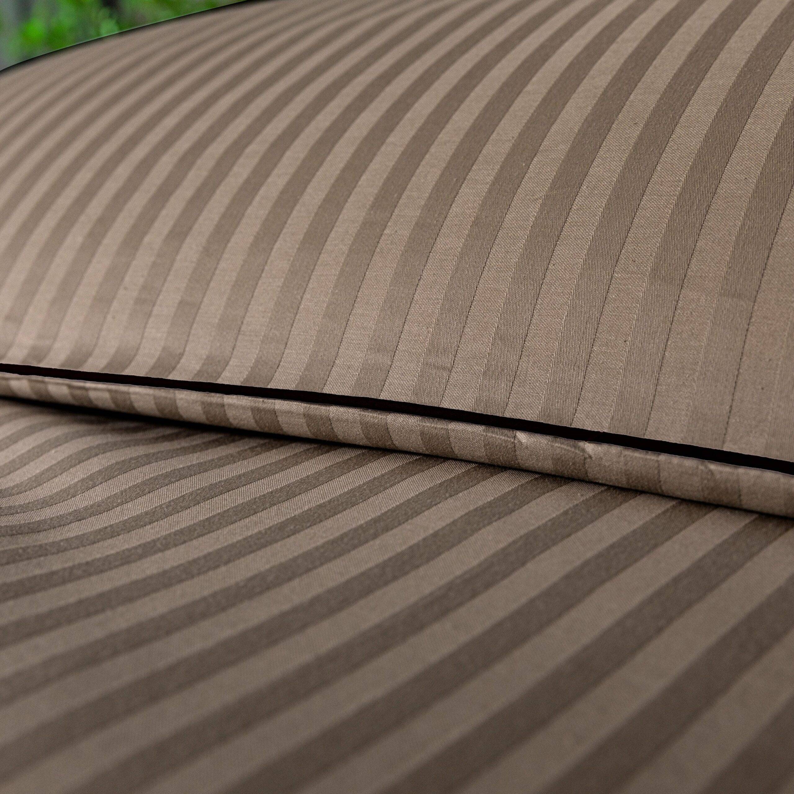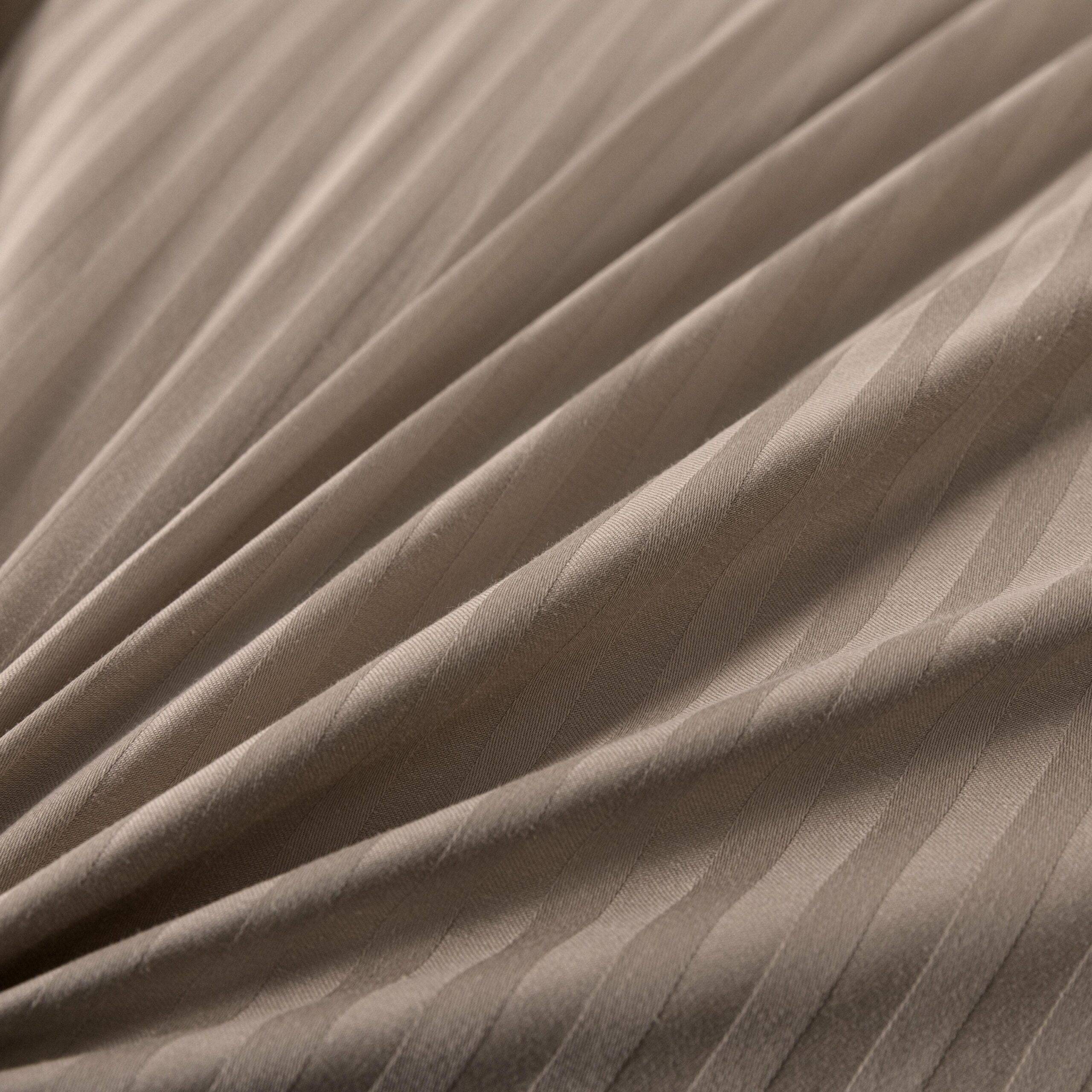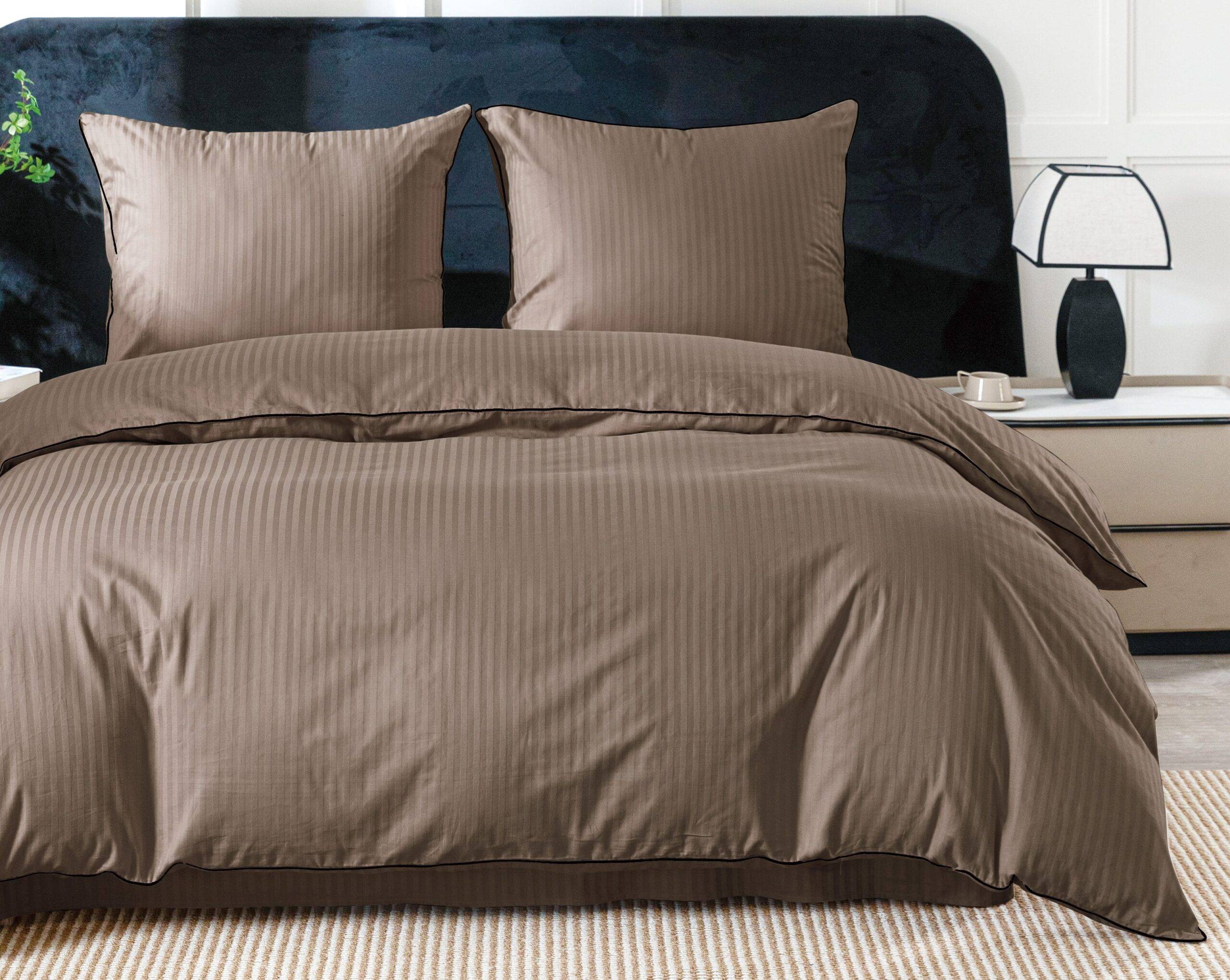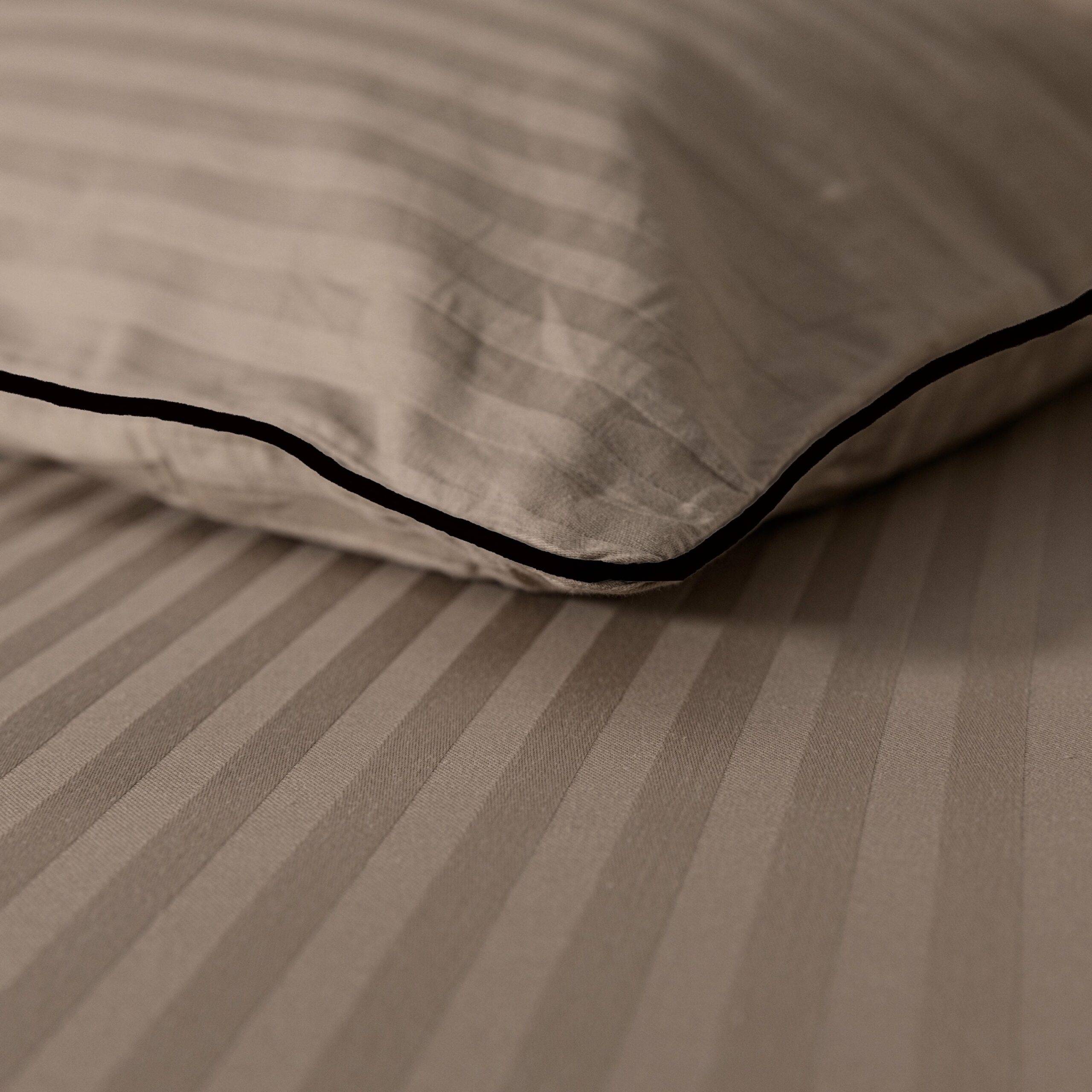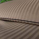 Audinio paviršių puošia subtilus, klasikinis dryžuotas raštas, būdingas aukštos klasės viešbučių patalynei. Komplektą papildo dailus kontrastinis kantelis, suteikiantis gaminiui išskirtinumo ir elegantiškai apibrėžiantis patalynės kraštus. Ši detalė ne tik papildo dizainą, bet ir sukuria tvarkingą, estetišką lovos vaizdą.